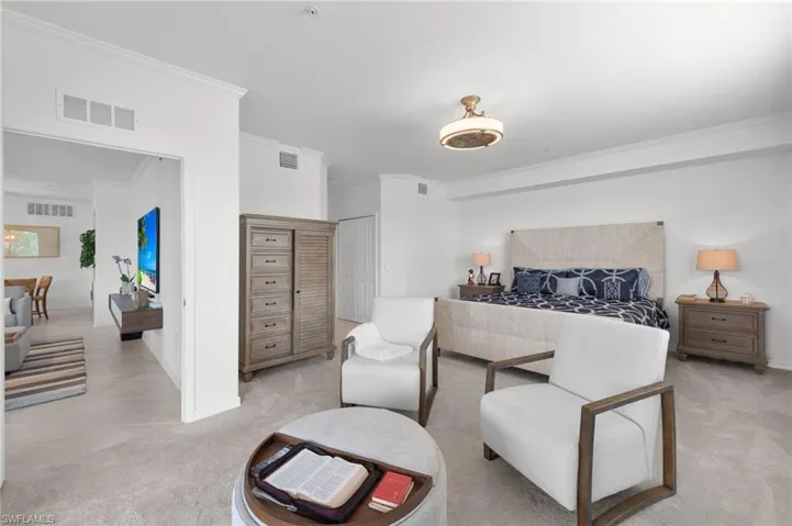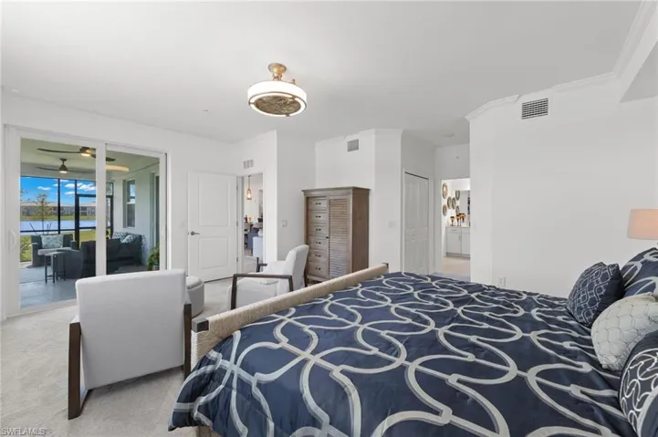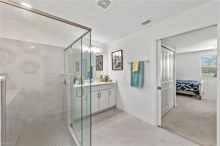 Inside, crown molding adds a touch of elegance, while custom closets ensure optimal organization and functionality. Retreat to the primary suite, where you’ll find a cozy sitting area, hurricane impact sliders to the screened lanai, and a lavish oversized shower. Custom shelving in the closets further enhances the space, offering ample storage for your wardrobe.