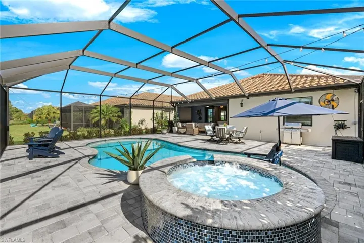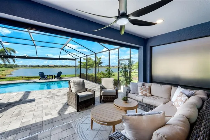 The kitchen and main living spaces flow seamlessly to the outdoor retreat, where you’ll find your own private oasis. Enjoy the extended lanai complete with a custom kidney-shaped pool and spa, perfect for relaxing or hosting guests. A picture window screen enclosure frames the stunning lake view, creating a serene and unobstructed backdrop. The outdoor space is elevated even further with a custom mini bar featuring cabinetry and a mini refrigerator—ideal for entertaining Florida-style.