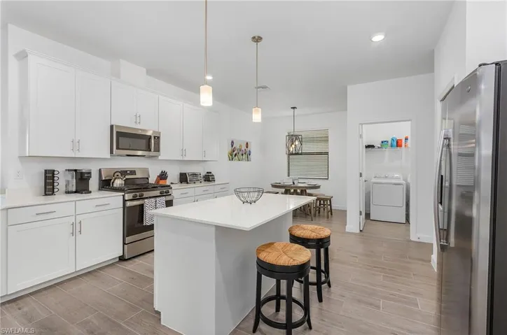 This popular Lennar Tivoli floor plan offers 4 bedrooms and 3 full bathrooms with a spacious open-concept layout designed for comfortable everyday living and entertaining. The kitchen features a large island with bar seating, gas range, stainless steel appliances, and ample counter space.
