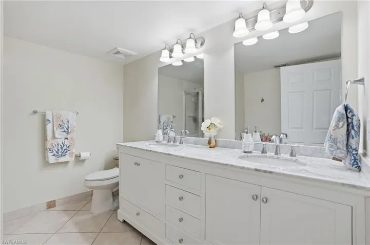 The spacious primary suite features an updated bathroom with dual vanities, offering both style and functionality.