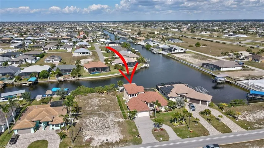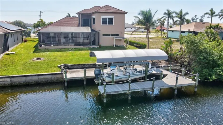Opportunity knocks in northwest Cape Coral. This spacious five-bedroom pool home with a den offers direct access and is located in the heart of the area’s exciting new development. The layout is ideal, with the master suite, two additional bedrooms, and the den all conveniently located on the main level. Recent upgrades include impact windows and doors (with shutters on two doors), a newly installed metal roof with ceramic coating following Hurricane Ian, and a whole-house 24kW generator powered by a buried 500-gallon propane tank — recently serviced and showing only 300 hours of use. A one-year home warranty covering major mechanical systems will be provided at closing for added peace of mind. Boaters will appreciate the covered lift rated for up to 10,000 pounds, along with a dock equipped with water and electricity that can accommodate a 30-foot vessel. The circular driveway adds ease of access, and all city water and sewer assessments are paid in full. Photos only hint at what this home truly offers. With so much happening in northwest Cape Coral, now is the time to explore this vibrant area. Schedule your showing today before this opportunity sails away.