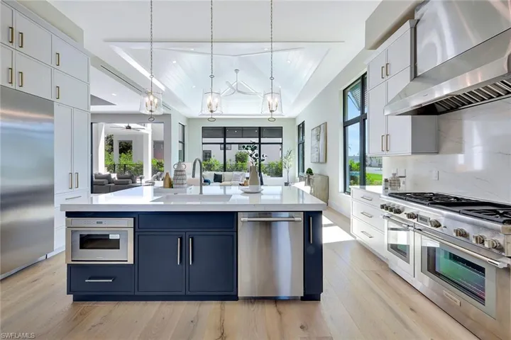 Listed below appraisal value. Appraisal completed March 10th, 2025. This exceptional corner lot graces the desired Vanderbilt Drive, between serene Vanderbilt Beach and Delnor Wiggins State Park. Thoughtfully designed, this five-bedroom plus den, five-bath residence embodies a blend of timeless architecture and modern sophistication. The open-concept interiors are bathed in natural light, showcasing luxury finishes throughout. A chef’s delight, the gourmet kitchen features top-of-the-line Thermador appliances, an expansive island and ample space for culinary creativity. The first-floor primary suite offers a private sanctuary with a spa-inspired en-suite bath, while two additional bedrooms with en suites ensure guests and family are accommodated in unrivaled comfort. Designed for convenience and elegance, the home includes an elevator, den and second-floor covered balconies. The outdoor retreat is an entertainer’s dream, boasting a resort-style pool and spa with a water feature, outdoor kitchen, ample covered seating and an expansive deck. Spacious two-car garage with ample room for a golf cart provides generous parking and storage. In North Naples, it provides effortless access to pristine beaches just a mile away, as well as world-class golf, upscale shopping and fine dining.
