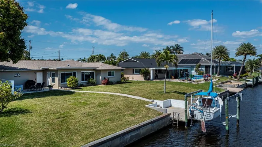 Direct access to the river & onto the Gulf of Mexico. Enjoy your kitchen & breakfast room, a sunny, light, bright & airy room every morning.. Generous kitchen features island, some updated appliances, plenty of cabinets & granite counter space. Outstanding view down the canal from the kitchen. Located next to the cul-de-sac on a dead end street. Double garage w/overhead storage racks. Washer, dryer, & laundry tub are in the garage as well. Windows have been replaced & are hurricane rated. This is a flood zone with a base elevation of 8′ per the city of Cape Coral. Large “Sweet” mango tree on S side provides lots of shade for the out side patio in the back. Large avocado tree in the front yard. Palaco Grande neighborhood has been one of the best for years. Convenient location close proximity to Publix, Walmart & Coralwood Mall. This one is a Gem.