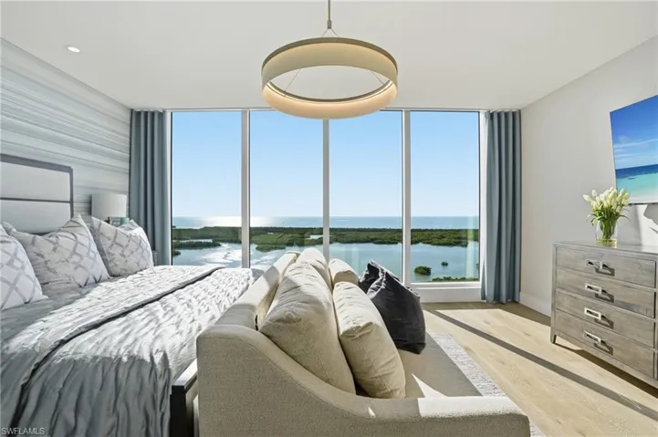 Perched on the 19th floor of Tower 400 at Kalea Bay, one of North Naples’ most sought after resort communities, this exceptional end-unit residence offers breathtaking, unobstructed views of the shimmering Gulf. Beautifully designed by Ron Alose, this four bedroom, four bathroom home showcases refined coastal luxury with sophisticated contemporary design. Expansive floor to ceiling windows and sliding glass doors open to a west-facing terrace, where panoramic sunsets over the Gulf become a nightly ritual. Inside, the open-concept great room and kitchen are anchored by a striking marble-inspired porcelain tile feature wall with an electric fireplace, creating an elegant yet inviting space for both everyday living and entertaining. Legno Bastone Italian white oak flooring flows throughout the residence, complementing rich walnut cabinetry and custom built-ins. The chef’s kitchen is thoughtfully designed with Wolf and Sub-Zero appliances, quartz countertops, a large island, wine refrigerator, and a butler’s pantry, blending beauty and functionality. The primary suite offers a serene retreat with stunning water views and a spa-inspired bath featuring dual vanities, a soaking tub, walk-in shower, makeup vanity, and an expansive custom closet. Two additional guest suites each feature en-suite bathrooms, large walk-in closets, and custom cabinetry, ensuring comfort and privacy for family and guests. Additional highlights include designer lighting, soaring ceilings, impact-resistant glass, solid wood doors, a private elevator entry, accordion storm shutters on the lanai, and a spacious laundry room with built-in storage. Residents of Tower 400 enjoy exclusive rooftop amenities including a pool, grilling area, fitness center, and clubroom with a catering kitchen. The Club at Kalea Bay is a spectacular 100,000-square-foot amenity center featuring resort-style pools, two restaurants with poolside dining, tennis, pickleball and bocce courts, a state-of-the-art fitness and wellness center, guest cottages, a dog park, beauty salon, business center, and an active social calendar. An optional membership to the private Moraya Bay Beach Club offers beachfront dining and full beach service, including chairs, umbrellas, towels, and food and beverage service directly on the sand. This exceptional residence presents a rare opportunity to experience elevated high-rise living and world-class amenities in one of Naples’ most prestigious coastal communities.