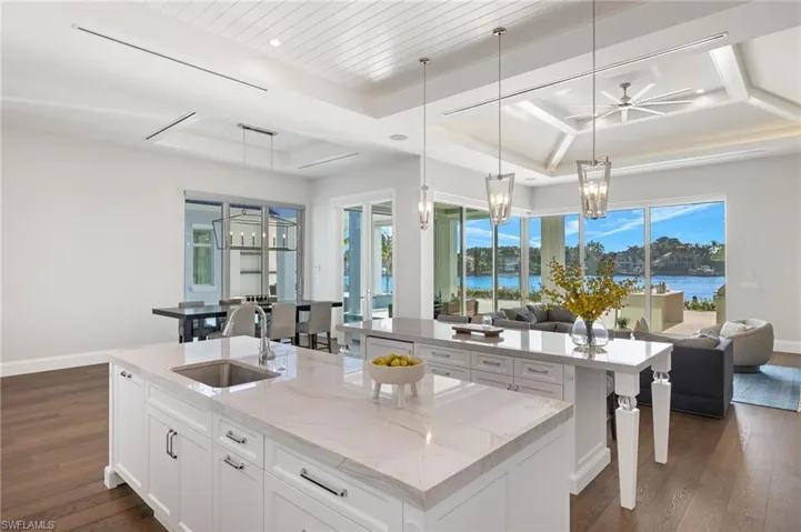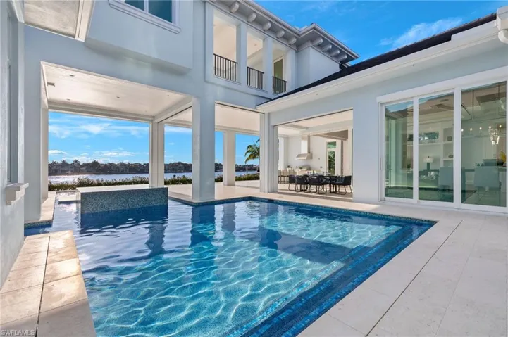 Welcome to 2649 Tarpon Road in prime Royal Harbor location boasting 100 feet of stunning Naples Bay frontage. Built in 2019 by Big Island Builders this incredibly designed western facing custom home features 5 Bedrooms and 6 Baths in almost 5300 square feet of living space under A/C. Enter the dramatic foyer to courtyard views of the outdoor saltwater pool, spa, fountain and bay views. Dramatic ceiling heights throughout and handsome wide plank hardwood floors. Impeccable craftsmanship and attention to detail throughout. Lovely office with custom built-ins. Open-concept living area with walls of sliding seamlessly blending indoor/outdoor living.