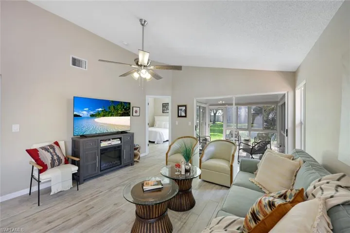 Coastal Elegance in Gulf Harbour Yacht, Golf & Country Club Experience the epitome of Florida living in this beautifully maintained 3-bedroom, 2-bathroom home nestled within the prestigious, gated Gulf Harbour Yacht, Golf & Country Club. Boasting vaulted ceilings in the living room, dining area, primary suite, and en-suite bath, this residence exudes a sense of spaciousness and light. The kitchen is adorned with white cabinetry and sleek granite countertops, perfect for culinary enthusiasts and entertaining alike. The primary suite features a generous walk-in closet, while the large, fenced side patio offers a private outdoor retreat for relaxation or gatherings. Recent updates include a new A/C system installed in 2023 and new, glass storm doors, ensuring year-round comfort. Residents enjoy access to an array of amenities, including a community pool, as well as optional membership to the clubhouse, and championship golf courses. Situated just 10 minutes from the pristine beaches of Sanibel and Captiva Islands, and in close proximity to the Caloosahatchee River, Fort Myers Beach, and the vibrant downtown River District, this home offers unparalleled access to Southwest Florida’s finest attractions. Nature enthusiasts will appreciate nearby destinations like the J.N. “Ding” Darling National Wildlife Refuge and Six Mile Cypress Slough Preserve, while history buffs can explore the Edison and Ford Winter Estates. Embrace a lifestyle of comfort, convenience, and coastal charm in this exceptional property.