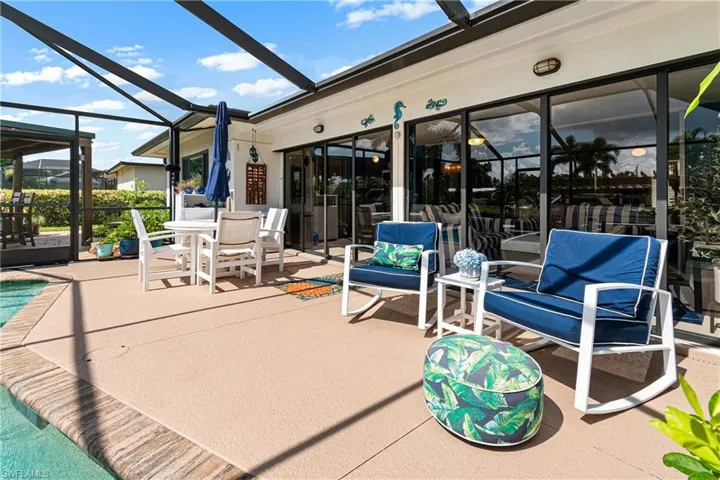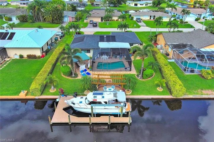 Welcome home and be prepared to fall in love with this stunning waterfront pool home! The home has been meticulously maintained and the attention to detail is amazing. It features three bedrooms and two full bathrooms. There are too many upgrades to mention (see attached list) such as a new roof, new impact resistant hurricane windows, new A/C, new luxury vinyl flooring, new carpeting, new tankless water heater, remodeled kitchen and bathrooms, new stainless steel appliances, new washer and dryer, new electrical panel, GAS for cooking, central vacuum system, and so much more! The renovated Florida room features 22′ of glass sliders, flooding the room with natural light. It’s the perfect space for entertaining or enjoying a good book! Outside is a tropical oasis with a heated saltwater pool overlooking stunning water views of the canal. The lanai screens have all recently been re-screened and have a transferrable, life-time warranty. As if that wasn’t enough, off the backyard is your very own brand new synthetic wood boat dock. Also new is the 10,000lb boat lift and pergola over the dock! Located on a wide canal with Gulf access (only one bridge) and just a few short minutes to the Caloosahatchee River, this home is a boaters dream come true! After a long day on the water, relax around the outdoor kitchen complete with stainless steel cabinets, granite counter-tops, outdoor TV, refrigerator, weber gas and charcoal grills, and a Green Mountain electric pellet smoker with detachable pizza oven. End your evening in the brand new hot tub. Surrounded by new lush tropical landscaping, you will truly feel like you are in paradise! Even the attached garage has been remodeled! It has a split air conditioning unit, new cabinets and new epoxy flooring making it a versatile space for crafting/woodworking, storage, or parking. This home is the epitome of Florida living and is within walking distance of the Cape Coral Yacht Club! It is also conveniently located near shopping, dining, hospitals, entertainment, and more! Additionally, with its prime location and desirable amenities, it offers excellent rental potential for the savvy investor.