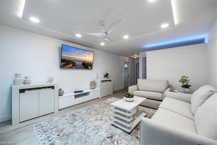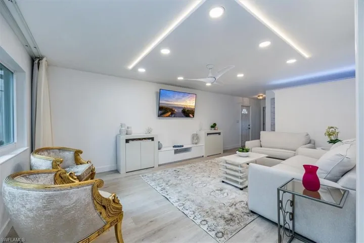 This beautifully updated ground-floor end unit offers over 1,200 square feet of living space with serene views of the lush grounds and a tranquil lake. Featuring wide-plank flooring, an updated kitchen with stainless steel appliances, custom cabinetry, a built-in bar, and quartz countertops which are enhanced by a custom lighting package which exudes modern elegance. The spacious living area is accented by an oversized window, providing ample natural light and multiple seating options. The reimagined primary suite maximizes functionality and includes a luxurious bathroom with a tiled walk-in shower and a large walk-in closet. The guest quarters feature generous closet space and a beautifully designed en-suite bathroom. In 2024, new impact-resistant windows and sliders were installed, ensuring safety and peace of mind. One of the highlights of this condo is the serene lanai, offering breathtaking views of a tranquil lake framed by a majestic banyan tree—a perfect spot to enjoy your morning coffee or unwind in the evening. Additional secured storage is accessible from the exterior of the building. Located within the Naples Bath and Tennis community, this property is surrounded by mature landscaping and impeccably maintained grounds, creating a peaceful retreat. Its prime location is just steps from shopping and dining options, while Naples’ pristine white sandy beaches are only minutes away. Discover the perfect combination of comfort and convenience in this exceptional home!
