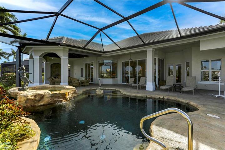 BEAUTY, PRIVACY + WOW, WHAT A VIEW, One story 3 BR 3.5 Bath 3040 sqft Sailboat gulf access home <15 min to open water, located inside the gates of Cape Harbour. Exquisite, furnished one-owner custom home built in 2004 by luxury builder Wyman Stokes, brilliantly designed to take full advantage of the expansive water views. Open floor plan, 12-14 ft ceilings throughout home w/10 ft sliders, high-end finishes, custom millwork, built-in wood cabinets. All bedrooms have on-suite full baths+extra pool bath. Great room, formal+family dining. Chefs kitchen w/breakfast bar, built-in desk. Stunning Primary Suite w/sitting area, large walk-in closet, office, luxurious bathroom w/separate vanities & dressing area. Central vac. Private screened lanai offers an additional 2230 sqft of living space w/12’ high-ceilings (1124 sqft covered & 1106 sqft uncovered). Outdoor grilling area, pagota style seating w/pecky cypress ceiling+gas-heated resort style pool/spa. 80 ft private composite dock w/20K boat lift. New roof+exterior paint. A short walk to marina, boat house, live music, restaurants & shops, Community Center w/pool, fitness room, tennis. Underground utilities w/royal palm lined streets.