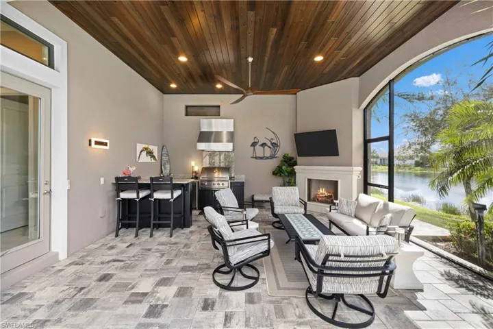 RARELY AVAILABLE “MERCEDE” MODEL WITH LOFT & ADDITIONAL COVERED LANAI SPACE OPTION IS NOW ON THE MARKET IN THE OYSTER HARBOR NEIGHBORHOOD OF FIDDLER’S CREEK! THIS GORGEOUS HOME ALSO FEATURES SPARKLING WIDE AND DEEP WATER VIEWS, SOUTHERN REAR EXPOSURE, GAS/SOLAR HEATED POOL/SPA, OUTDOOR KITCHEN, AND 2 FIREPLACES. Built by Taylor Morrison in 2017, this impeccably kept Residence is “HURRICANE READY” with a 20KW Whole Home Cummings GAS GENERATOR, IMPACT WINDOWS/DOORS and STORM SCREENS that close off the lanai. The flexible layout offers 4 Bedrooms (all with En-Suite Bathrooms and one doubling as a POOL BATH) + Den + Oversized Loft with Additional Full Bath, Powder Bath, 3 Car Garage, 4,462sf living area. The open concept Greatroom with SOARING 14’ TRAY CEILINGS, MAGNIFICENT STONE ACCENT TV/FIREPLACE WALL with Custom Cabinetry, shelving and accent lighting. The Greatroom is connected to a Stunning Chef’s Kitchen with an ENTERTAINMENT BAR and Wine Chiller, Rich Espresso Cabinetry with SOFT CLOSE Doors/Drawers, QUARTZ Countertops, Custom BACKSPLASH accented by UNDERCABINET LIGHTING, and Built-In Stainless Steel Appliances. The heart of the home opens up to a MASSIVE OUTDOOR ENTERTAINING SPACE with TRANQUIL LAKE VIEWS. The Two Covered Lanais showcase RICH WOOD “TONGUE IN GROOVE” CEILINGS. One Lanai is fully equipped for the family Grillmaster, with a DELUXE OUTDOOR KITCHEN and EXTERIOR FIREPLACE to warm you up on those cool winter evenings. The second lanai provides an abundant amount of space for dining and lounging by the CUSTOM SALTWATER POOL AND SPA (heated by SOLAR AND GAS) and even features an OUTDOOR SHOWER for convenience. Enjoy sun on the pool all day with this SOUTHERN Rear Exposure homesite. As you enter the home through the front DOUBLE DOOR with glass inserts, you will be greeted by large foyer that’s surrounded by windows and doors with TRANSOM WINDOWS letting abundant natural light into your living space, ACCENT WALLS, Designer Light Fixtures and Ceiling Fans; Hunter Douglas window treatments, LUXURIOUS POLISHED TILE Flooring throughout the main areas of the home and ENGINEERED WOOD in Den and Primary Suite. The Primary Suite boasts Volume Ceilings with RECESSED TRAY, CUSTOM CLOSETS and large windows connected to a luxurious Primary Bath with large WALK-IN Shower and Soaking Tub. Upstairs you’ll find an OVERSIZED LOFT with KITCHENETTE/WET BAR and two built in MURPHY BEDS, FULL BATH and another guest suite with private en-suite bath. Additional features include: CENTRAL VAC, TANKLESS Hot Water Heater, Garage EPOXY Floor, RADIANT ROOF BARRIER system. Fiddler’s Creek offers its residents an active lifestyle with a modern fitness center accompanied by bocce, tennis and pickleball along with an active social event calendar. Enjoy relaxing by the resort style pool with casual and fine dining. Golf, beach and marina memberships available.