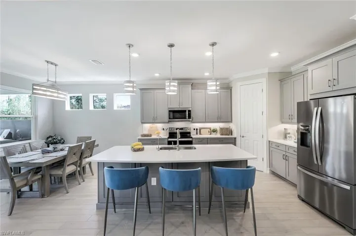Welcome home to one of Bonita Springs newest, most popular communities, Seasons at Bonita! This 2022 built, 3 car garage home is FULLY FURNISHED and waiting for it’s new owner. The “Shelby” floor plan offers 3 bedrooms + a den and FOUR bathrooms. The finishes include plank “wood look” tile and quartz countertops. The entire home has impact doors and windows, extended driveway, outdoor kitchen, and a large yard with plenty of room for a pool if desired! The home backs up to over 60,000 acres of protected preserve land that has miles of walking and biking trails and offers complete privacy. Seasons is a gated, pet friendly community with two dog parks and allows fencing. There are 8 Pickleball courts, 3 tennis courts, 6 Bocce courts, a gym, resort pool and lap pool, large community room for parties and offers very low HOA dues.