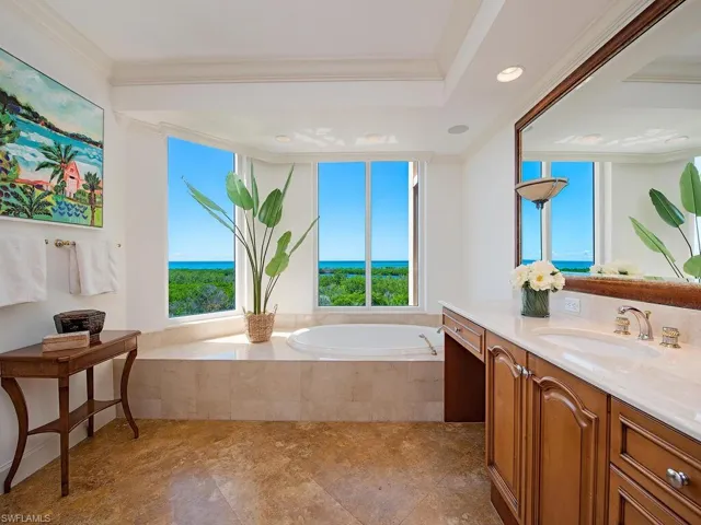 Behind the gates of Crown Colony sits the elegant Cap Ferrat. Experience the allure of this gracious residence and rarely available Pelican Bay 4 BR, 4 BATH + FAMILY ROOM + POOLSIDE CABANA. With 3,650 sq ft under air, this gem has uninterrupted VIEWS of the GULF and is anchored by the verdant tropical mangrove and palm canopy vistas. A secure elevator sweeps you directly to your own private foyer welcoming you to a bright and generous living room. Designed to maximize and blend living/entertaining spaces with timeless sophistication, the home also features expansive Easterly and Westerly lanais and terraces inviting you to savor tropical Florida Gulf breezes, sunsets, sunrises, and serenity. The well-equipped Chef’s kitchen features handsome custom cabinetry, updated SS appliances, NATURAL GAS cooktop, along with two Sub-Zero beverage drawers AND a charming sun-lit morning room. Separate and spacious family and dining rooms easily accommodate large family or friend gatherings. Four split bedrooms invite maximum privacy. The owner’s suite is bathed in SUNLIGHT and GULF VIEWS and has both his and her separate baths and separate walk-in closets. This extraordinary residence also includes your own deeded, personal poolside CABANA with a gathering room, full bath, and private patio complete with gas BBQ grill and is located just steps from the stunning, expansive resort-style saltwater pool and spa. Cap Ferrat is well recognized for its significant and luxurious tower amenities. Owners enjoy the 24/7 guard-gated entrance, 24/7 front-desk personnel, multiple grand social gathering areas, expansive fitness, personal men’s and women’s spa therapy rooms, along with two beautifully appointed guest suites. The under-tower garage offers owners two deeded side-by-side parking spaces, along with a community electric charging station. This tower is also prized for being just steps away from the Pelican Bay beach tram station allowing one to easily access Pelican Bay’s myriad of private membership-included community and beachfront amenities: 2 private beachfront restaurants, attended beachfront services, attended fitness, learning center, 18 Har-Tru® tennis courts, sailing, pickleball park now in progress, plus miles of kayaking, biking, and walking paths. Ask about the never-ending Pelican Bay active social calendar, too! Artis Naples Performing Arts Center, upscale Waterside Shops, lively Mercato, and The Naples beachfront Ritz-Carlton Hotel all just moments away. This is your opportunity to live where refined elegance meets an exceptional lifestyle!