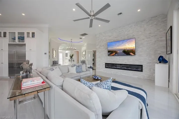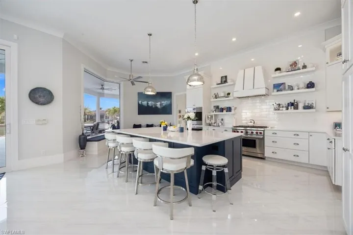 Experience waterfront luxury at its pinnacle! Twin Palms is a spectacular estate, set on a prized tip lot with 217 ft of water frontage. This breathtaking designer home was renovated and redesigned in 2022. You’ll entertain in style with an open-concept living space with soaring ceilings. Most rooms feature jaw-dropping views of the converging waterways. The gourmet kitchen features a center island, Wolf range and custom waterfront window seat. There is a linear fireplace and multiple sliders in the living room. The waterfront wet bar is a special place to celebrate life on Marco Island. The primary suite rivals a boutique hotel with beautiful views and custom walk-in closets. The bath is spa-like and boasts dual shower panels, a designer tub, and floating vanity. A spacious first floor guest suite overlooks the glistening pool and features a custom closet and new bath. The remaining bedrooms are king-sized with oversized closets. The expansive lanai situated so you’ll enjoy both sunrises and sunsets. The saltwater pool and spa are sun-drenched. Boating enthusiasts will love the new dock featuring two lifts plus a Jet Ski platform. The new 24×24 sun deck perfect for soaking up the endless Marco sunshine. The lush landscaping wraps around the property like a private resort. Luxurious dolomite floors, an ice maker, Navian hot water heater and whole-house generator are just some of the special features of this estate. Designer furnishings are available. Twin Palms is a very special luxury property.