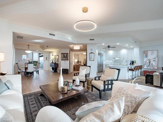 This updated Treviso unit offers stunning bay/gulf views at The Colony Golf & Bay Club. As you step into your private elevator lobby, you’ll notice fresh updates, including new wood-look floors in the main living areas. The Family Room, Living Room and Primary suite all bring in great sunset views through walls of glass. The open kitchen is modern with white cabinets, new Sub-Zero and Bosch appliances, and new Quartz counters. Primary suite features double closets and transformed bath with large porcelain tile floors, new shower surround, ½” shower glass, new tub, and white vanities. The spacious guest suite enjoys privacy and sunrise views. The den can double as a third bedroom if needed. Laundry room has new Electrolux Washer & Dryer. Treviso’s common areas feature transitional furnishings and marble floors overlooking water features. Amenities include a social room, billiards room, theater, fitness center, and three guest suites. Outside, a water feature flows down to the spa and pool with a graceful beach entry. Colony amenities include Bay Club with waterfront dining, beach park with a boat shuttle, and a kayak park. Equity Golf is optional at the Colony Golf Club